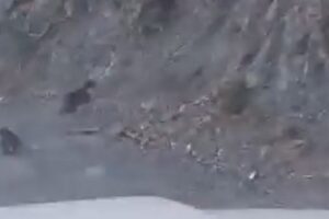 Kaçacak yer arayan ayılar, aracın önünde metrelerce koşarak akabinde dimdik yamacı tırmandı. Sonrasında ayılar gözden kayboldu.