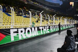 Tribünlerde Filistin bayrakları yer alırken, kale ardı tribününe, İngilizce olarak “Nehirden denize özgür Filistin” yazılı pankart asıldı.