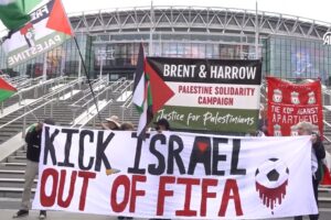 “İsrail’i FIFA’dan atın”, “Filistin’e adalet”, “İsrail’i boykot edin”, “Yaşasın özgür Filistin” sloganları ve Filistin bayraklarıyla yürüyüş yapan protestocular; İngiltere Futbol Federasyonu’na, İsrail’in UEFA ve FIFA tarafından men edilmesine dayanak vermesi davetinde bulundu.