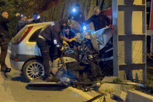 Otomobil üst geçit ayağına çarptı, enkaza döndü
