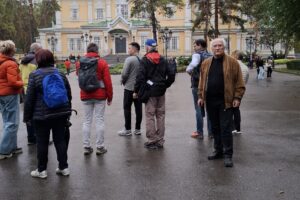 Yürüyoruz. Kentin çiçekli, ağaçlı geniş caddeleri ve planlı dokusu rahatlatıyor hepimizi. Eldiyar açıklamaya devam ediyor: “Kazakistan’da aylık elektrik masrafı 4 Dolar karşılığı Tenge ödenir. Gaz 3 dolar, su 2 dolar, internet 8 dolardır. Aylık gelir 800-1000 dolar.”