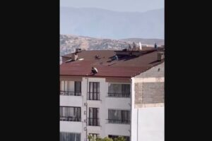 Elazığ’ın Sürsürü Mahallesi’nde emekçiler, hiçbir güvenlik tedbiri almadan 5 katlı bir binanın çatısında çalıştı. Vatandaşlar tarafından cep telefonu kamerasıyla kaydedilen imgelerde, çalışanın metrelerce yüksekte önlemsiz biçimde çalıştığı görüldü. O anlar yürekleri ağza getirdi.